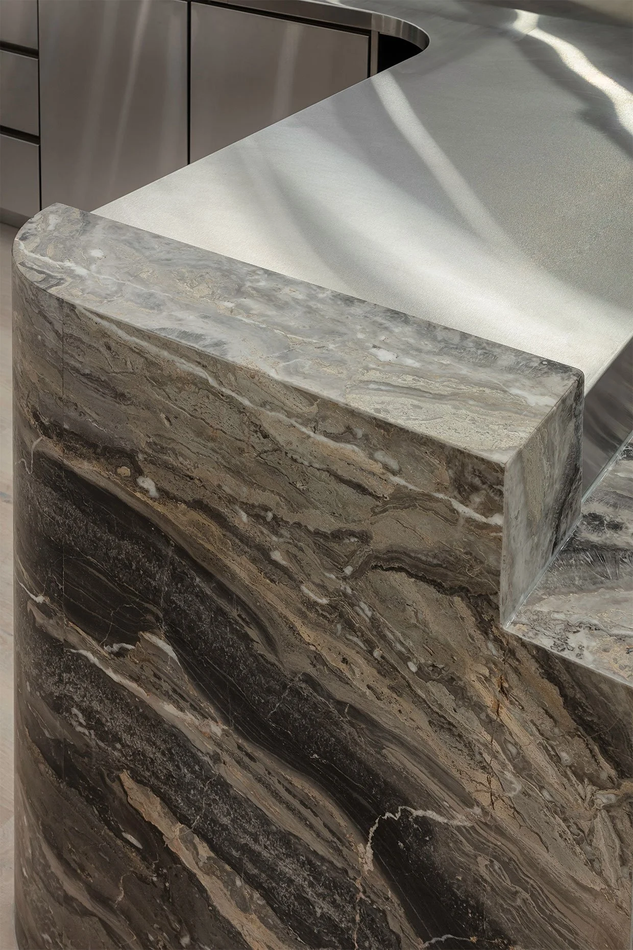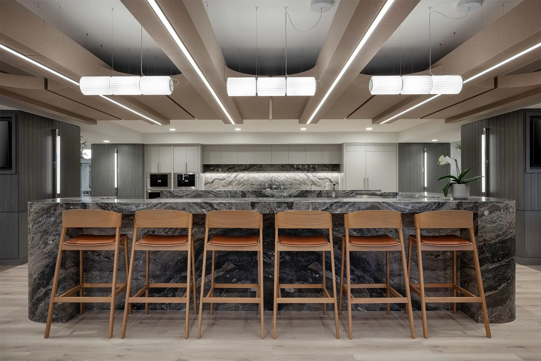 Connection, interaction and wellness is brought to life in this workspace; the result emulates the peaceful feeling of walking through a Canadian forest. Biophilic design combined with soft seating and soothing lighting promote focus and harmony through the human to nature connection. Expanded stairwells, widened corridors and touch-down spaces encourage impromptu work interactions. The statement stone reception desk, geode cafe surfaces and area rugs mimicking rock strata combine with technology in a melding of nature with the man-made.